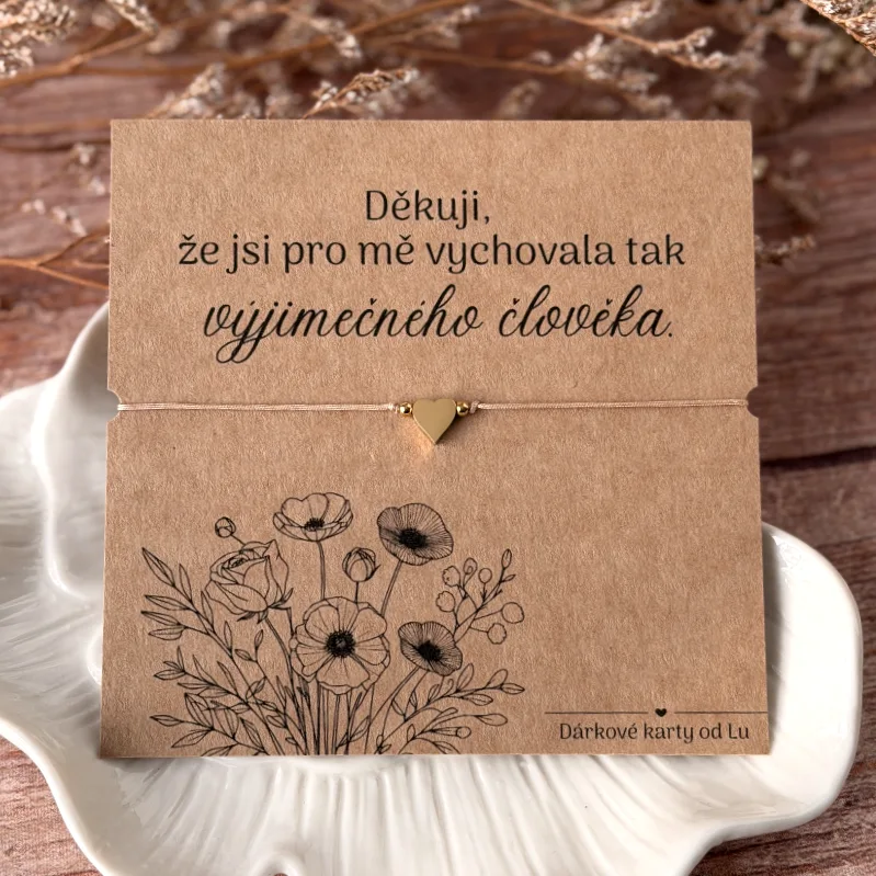 Tento náramek, který je spojením jednoduchosti a vkusu si získá srdce vaší budoucí tchýně. Text, který je doplněn na kartě ji zase vyjádří, jak moc si ji vážíte. Která matka by nechtěla slyšet, že dobře vychovala svoje dítě. Vyjádřete slova díků tímto nezapomenutelným způsobem.