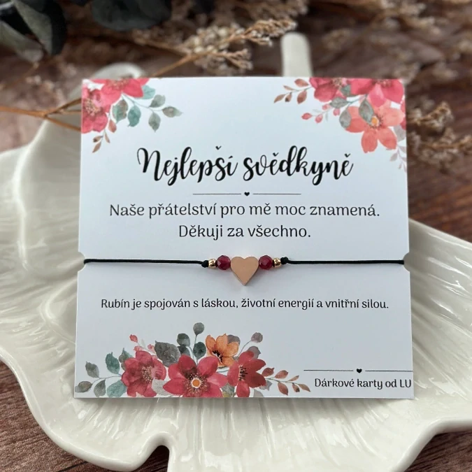 - Materiál: náramek je vyrobený z nerezového srdce v odstínu rosa gold, který je obklopen drobnými broušeným Rubínem ve velikosti 4mm.
