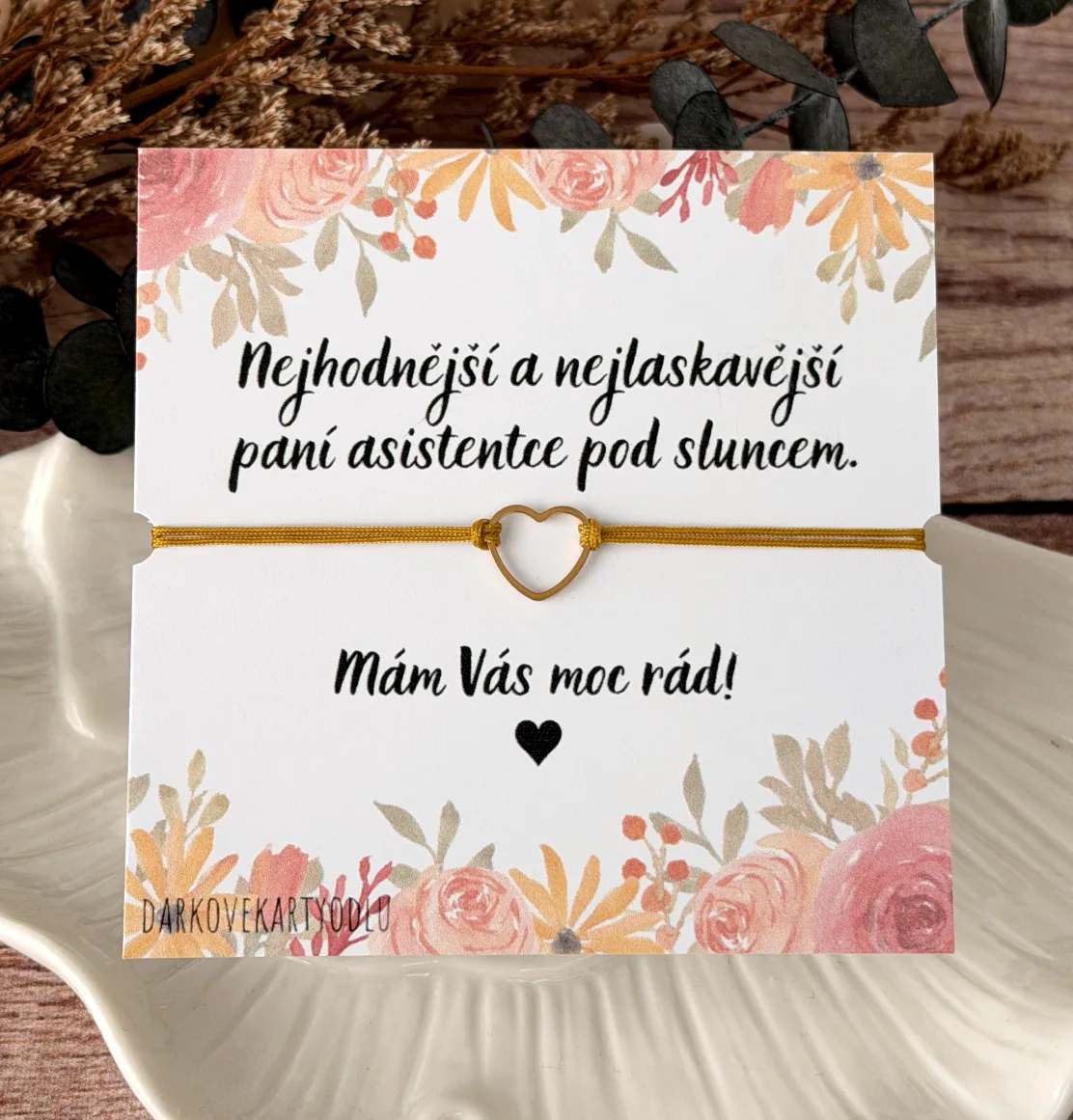 - Dárkové balení: náramek je navlečený na dárkové kartě s dojemným textem. To vše je vložené do krabičky, zdobené dřevěným srdíčkem. Překvapení nachystané rovnou k darování.