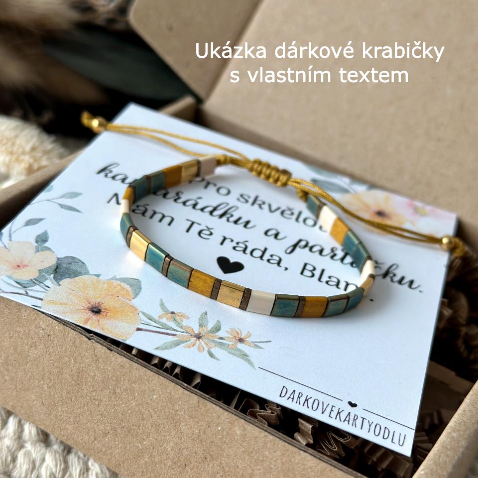 - Dárkové balení: náramek můžete zakoupit samostatně, kdy vám dorazí v látkovém pytlíčku nebo s dárkovou krabičkou a dárkovou kartou, na kterou vám napíšu váš vlastní text.